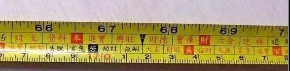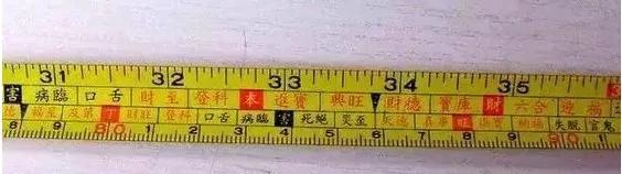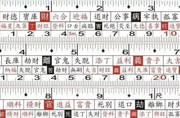 鲁班尺上有八个字,分别是上面讲过的财、病、离、义、官、劫、害、本,在每一个字底下,又区分为四小字,来区分吉凶意义。