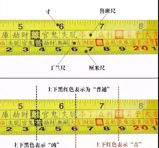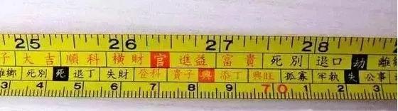 鲁班尺的测量方法: -- 测门量内径;测家具量左右两边。 -- 以公分(厘米)为准,参考中间的黑线以上的字,比如38厘米在财至上,那么38厘米即为吉祥的尺寸,可放心的采用。 鲁班尺上的门洞吉数:若换算为公制尺寸,通常吉数尺度有21-23cm、40-42cm、60-62cm、81cm、88cm、89cm、106-108cm、126-128cm、133cm、146cm、155cm、171-176cm、191-198cm、211--216cm、 231-236cm、241cm、253-256cm、261-263cm、275cm、281-283cm。 一般而言,现代门的高度都不超过283cm,对于普遍的住宅,大门宽度(即见光度,是门框内壁的水平距离,不包括门框的厚度)多为108cm,高度多为212cm左右,而房门的宽度多为81cm,高度多为198cm,这样的尺度是大众皆宜的。【鲁班经】认为,一般百姓家安“财门”和“吉门”最好。